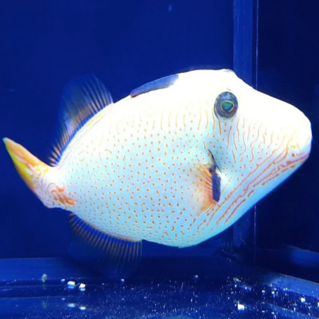 The Aberrant Undulated Trigger (Xanthic) is a unique variant of the Balistapus undulatus. Originating from the Philippines, this species is a rare sight, with only a few specimens caught annually. It displays a distinct pattern where its usual undulating lines are replaced with spots, and the tail spines are bright orange rather than black.