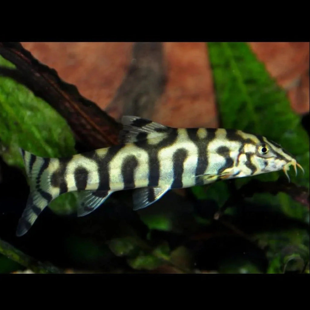 The Lohachata Botia Loach, sometimes referred to as the Yoyo or Pakistani Loach. These fish can be identified by their four pairs of barbels, protruding from the mouth area, along with their silvery/gold coloration with black irregular striping.
