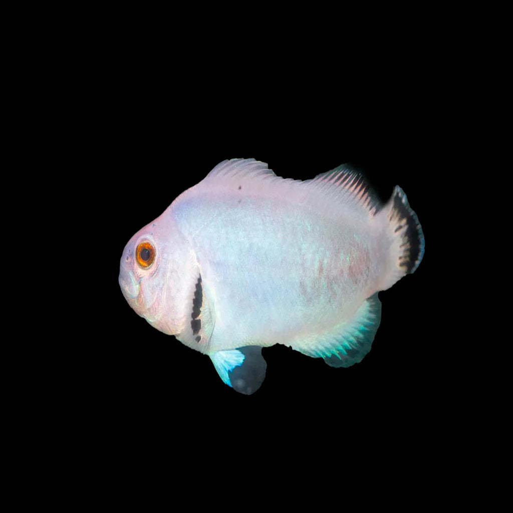 Snow Storm Clownfish are a captivating variety of the common clownfish (Amphiprion ocellaris), known for their striking white coloration with black markings. They are a designer clownfish strain, developed through selective breeding, and are highly sought after in the aquarium hobby.