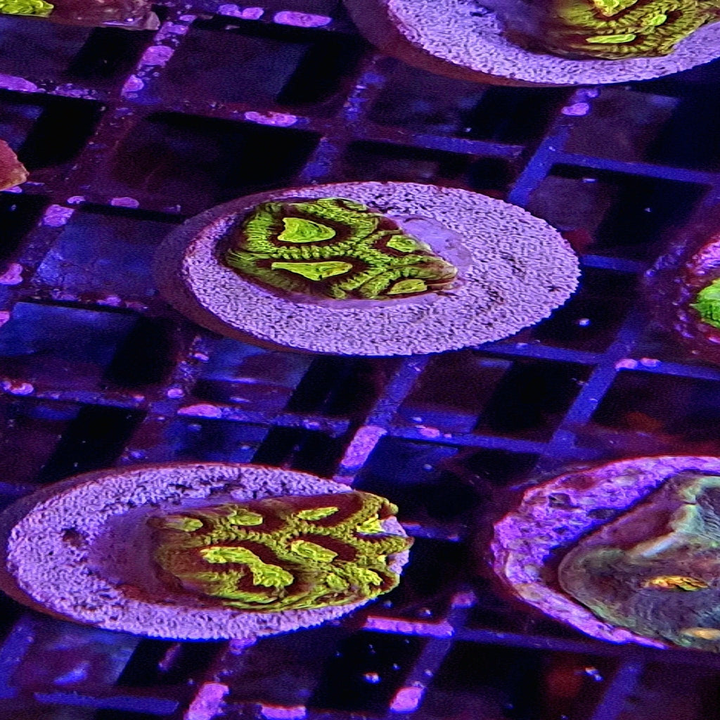 The Space Monkey Favia is a striking and popular variety of coral in the marine aquarium hobby, known for its vibrant and otherworldly colouration. This type of Favia coral, a Large Polyp Stony (LPS) species, features a rich mosaic of colours, often showcasing a mix of deep blues, greens, and purples, with contrasting brighter hues that can resemble a starry night sky, hence the name "Space Monkey." Each individual polyp of the coral contributes to this stunning display, creating a mesmerising effect in the aquarium. The Space Monkey Favia is appreciated for its hardiness and relatively easy care requirements, making it suitable for a range of aquarists, from beginners to experts. It thrives under moderate lighting and water flow conditions and is known for its slow, steady growth. This coral not only adds a splash of colour and intrigue to the reef tank but also plays a role in the tank's ecosystem, offering shelter and adding to the biodiversity of the marine habitat. The Space Monkey Favia is a captivating and exotic addition, bringing a piece of the ocean's mystery and beauty into the home aquarium.