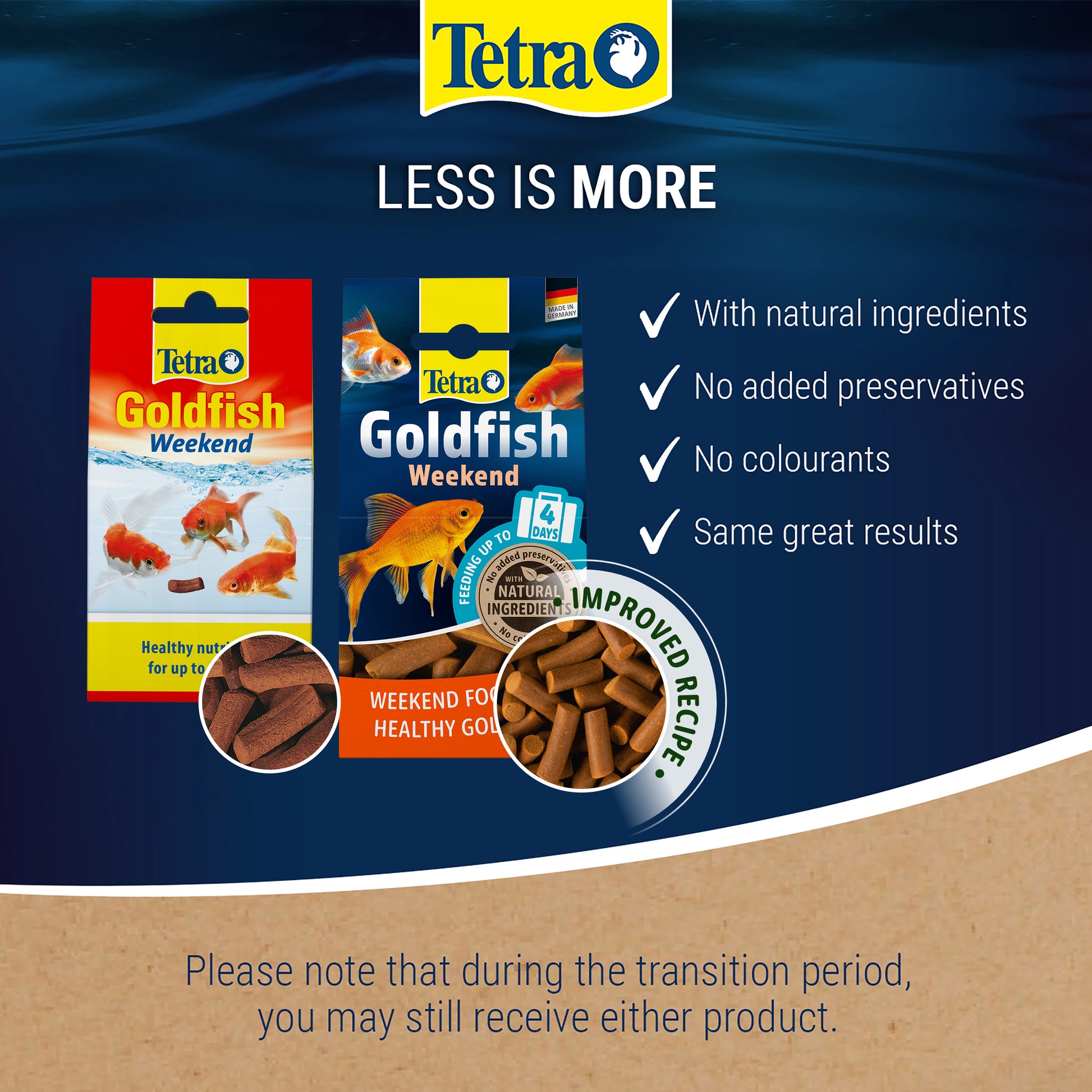 Tetra Goldfish Weekend.Compact sticks for feeding goldfish and other coldwater fish while you are on holiday or away for the weekend.The sticks can be perfectly dispensed and last for up to 7 daysWith a high proportion of essential minerals and a high protein contentHardened by a special production process without binding agents that are difficult to digestDoes not affect the water quality10 Sticks.