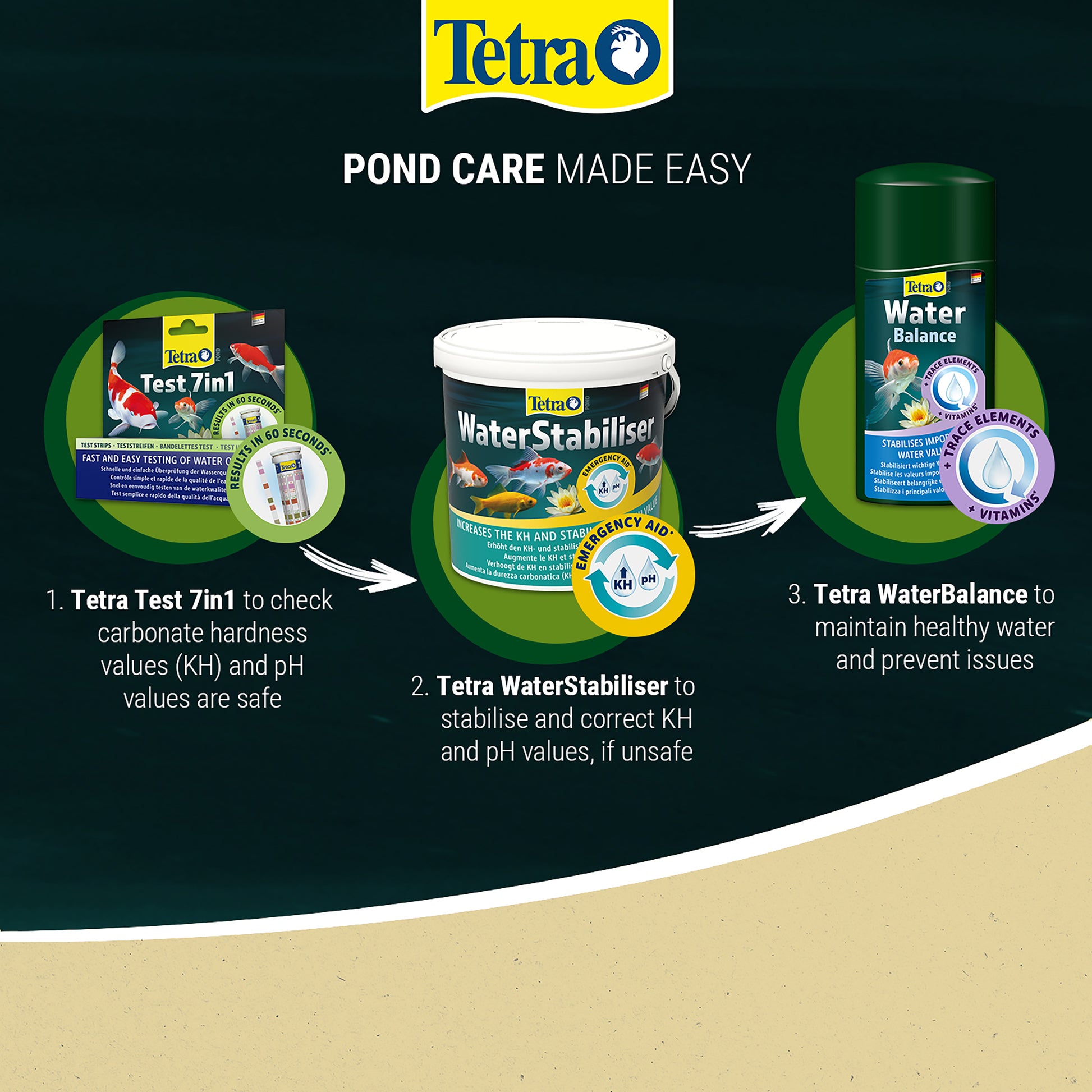 Pond Water needs to have the correct balance to be healthy for the fish living inside. Anything small can disrupt the balance and cause stress in the fish possibly resulting in death. Tetra Pond Water Stabiliser is a quick and effective treatment that stabilises the important water values like pH and kH (carbon hardness). Stable levels ensure a healthy environment in the pond. The treatment increases the kH levels and prevents the water from becoming too soft. This results in a more stable pH value and prevents any loss of fish. It dissolves quickly and does not cloud working immediately to produce quick and effective results. 1.2kg Tub Treats 10000 Litres Pond Water (KH increase by about 4 dH). Dosage: Monthly dispense 1/2 tub per 5000 Litres of Pond Water. If required re dose eg after heavy rainfalls or prior to application of anti algae products and medications.