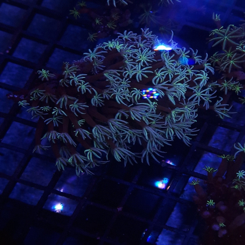 Pipe Organ Coral (Tubipora musica) is a soft coral with hard exoskeleton. The exoskeleton is made up of calcareous tubes that are characteristically red to maroon in color. The polyps that extend from them are white, tan, grey or green and look like flowers with feather petals.